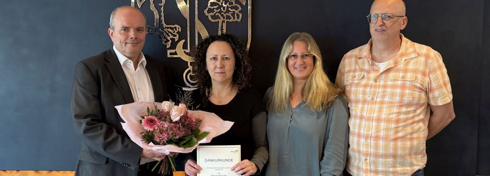 Bürgermeister Steffen Weiß überreichte Frau Arioglu in einer kleinen Feierstunde eine Urkunde, einen Blumenstrauß sowie ein kleines Präsent. Gemeinsam mit Gerd Schweickert, stellvertretender Abteilungsleiter der Finanzverwaltung, sowie der stellvertretenden Vorsitzenden des Personalrats, Susanne Buchfink, sprach er Frau Arioglu seinen Dank und die Anerkennung der Stadt Wörth am Rhein für ihre langjährige und zuverlässige Tätigkeit im öffentlichen Dienst aus. Der Bürgermeister freut sich auf die weitere Zusammenarbeit.