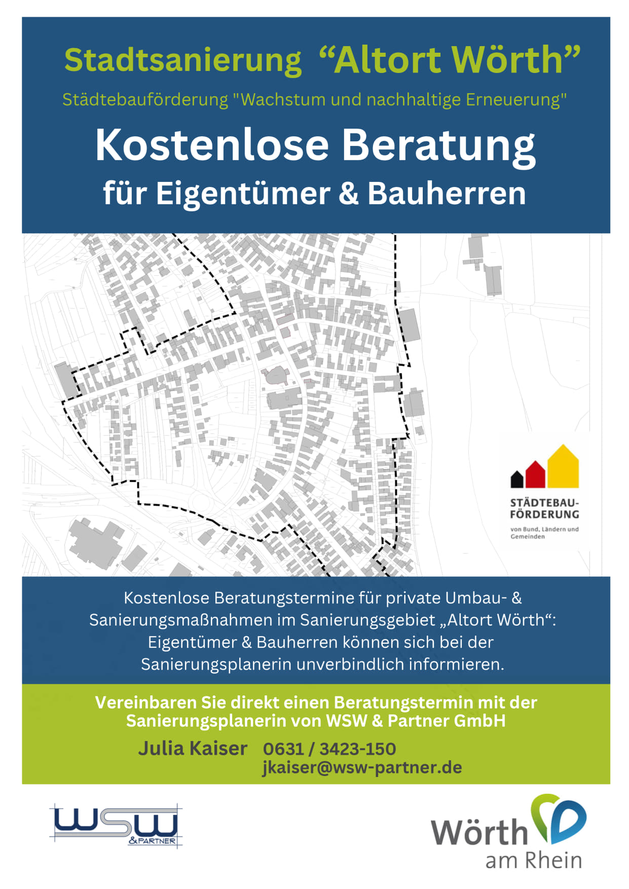 Im Rahmen des Städtebauförderprogramms „Wachstum und nachhaltige Erneuerung“ können private Umbau- und Sanierungsmaßnahmen im Sanierungsgebiet „Altort Wörth“ bezuschusst werden. Die Stadt bietet hierzu den Eigentümern und allen weiteren Interessierten kostenlose Beratungsgespräche mit der Sanierungsplanerin Julia Kaiser vom Planungsbüro WSW & Partner GmbH an.