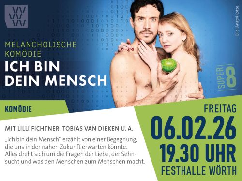 Am Freitag, 6. Februar, um 19.30 Uhr, gastieren die Hamburger Kammerspiele mit der melancholischen Komödie „Ich bin dein Mensch“ in der Festhalle Wörth. Das Stück führt in eine Welt künstlicher Intelligenz und stellt die Frage, was den Menschen zum Menschen macht – und ob eine Maschine lieben kann; auf der Bühne stehen unter anderem Lilli Fichtner, Valerija Laubach, Ingo Meß und Tobias van Dieken.