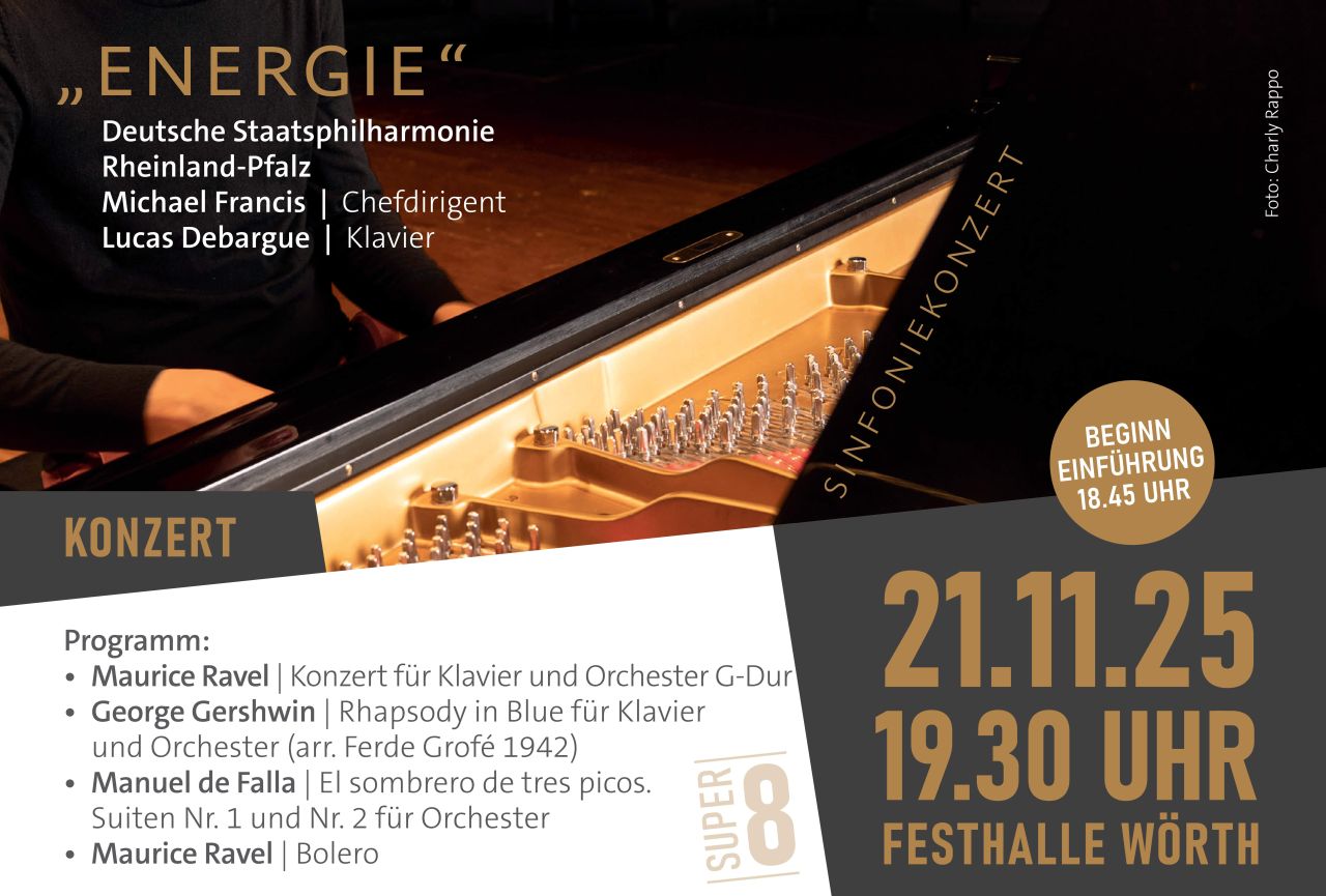 Unter dem Titel Energie präsentiert die Deutsche Staatsphilharmonie Rheinland-Pfalz unter der Leitung ihres Chefdirigenten Michael Francis ein Programm mit Werken von Maurice Ravel, George Gershwin und Manuel de Falla.
